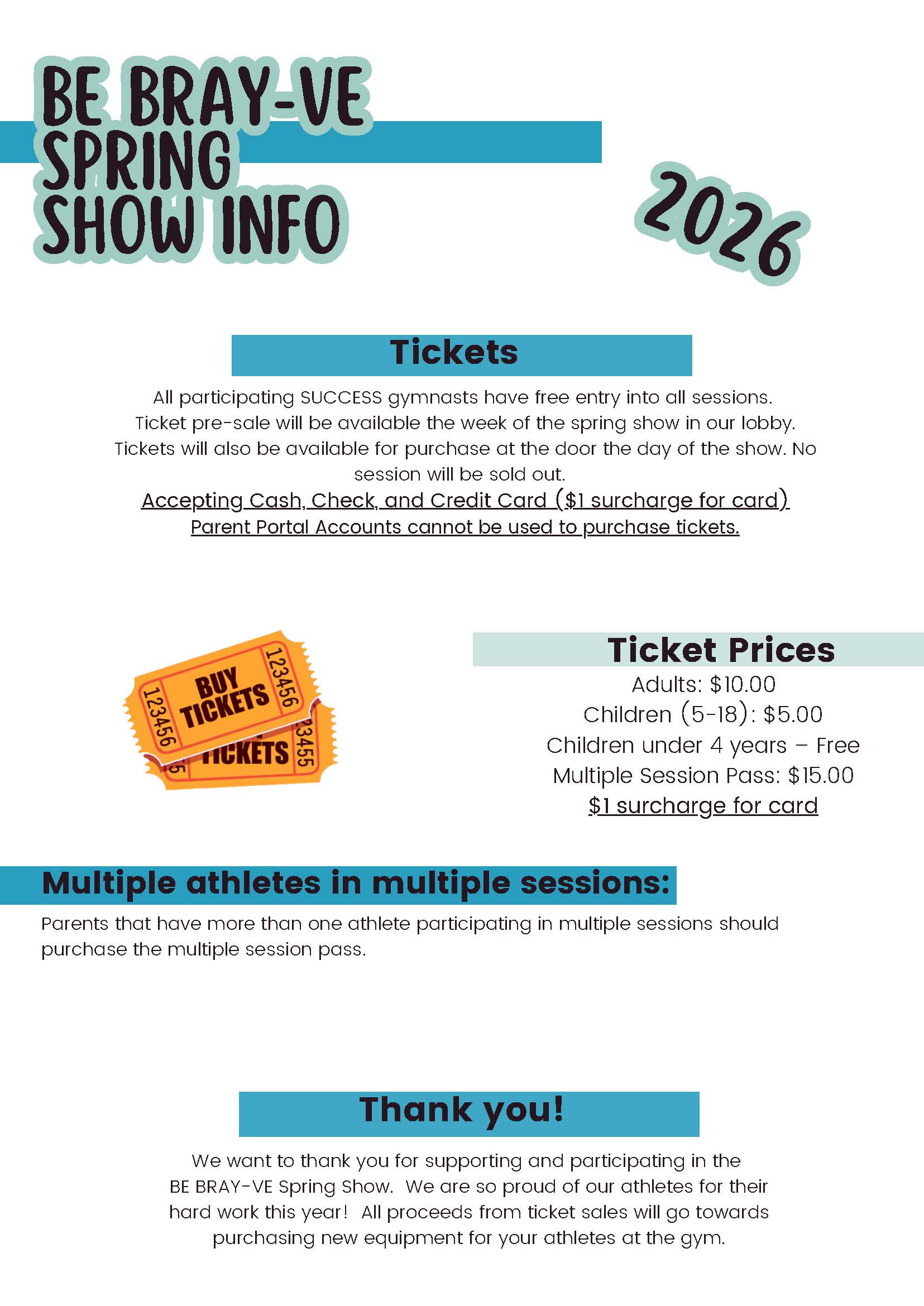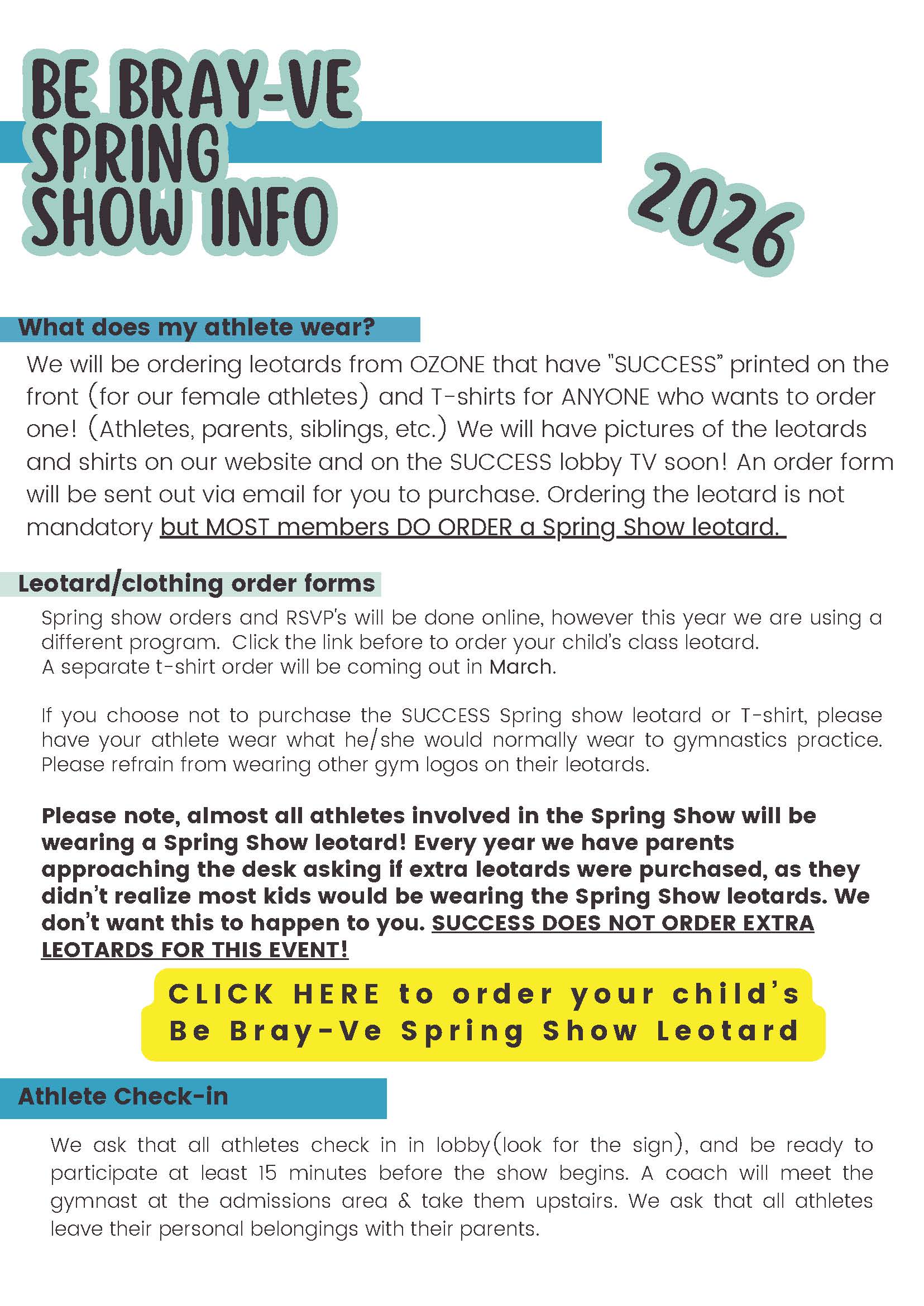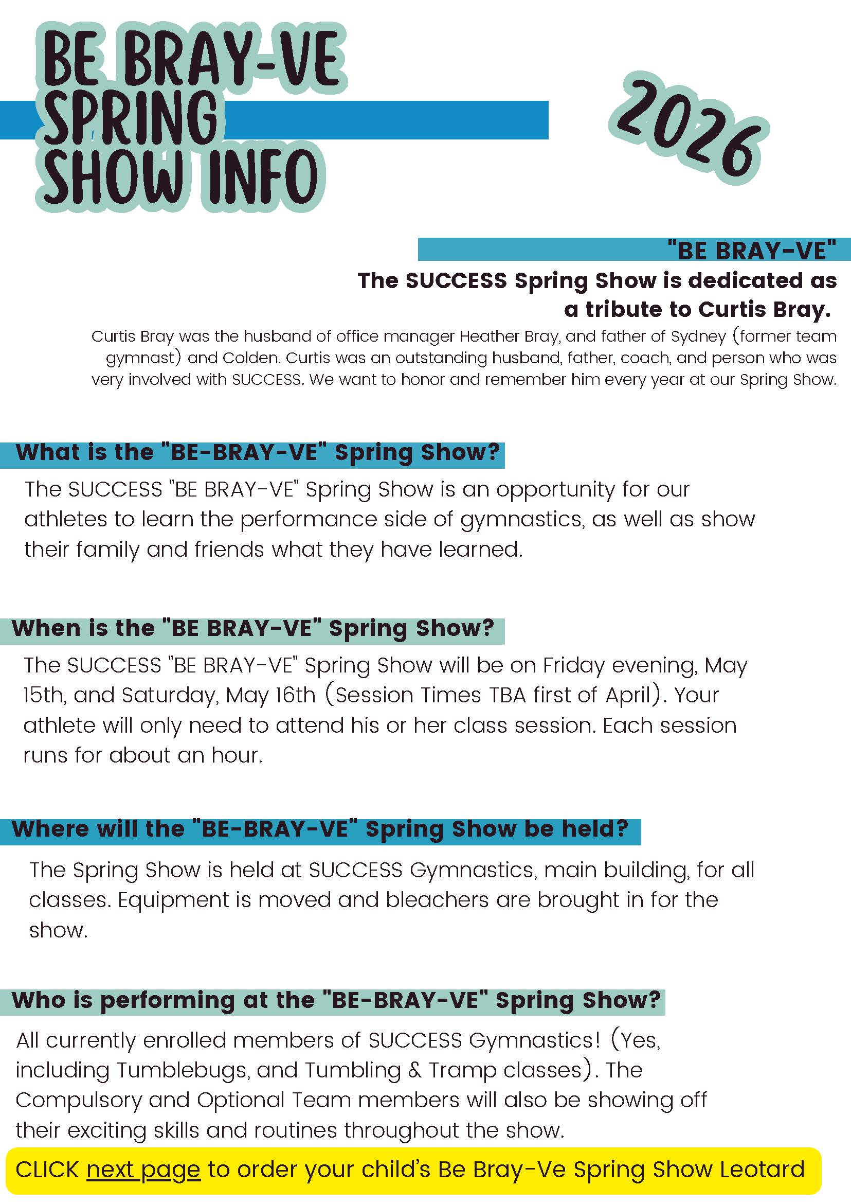 Throughout the SUCCESS “Be BRAY-ve” Spring Show, gymnasts will perform routines based on the class they are in for parents, family, and friends! Check out our 2025 information packet below!